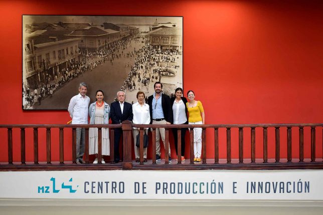 En las imágenes inferiores, la directora de la AEL y el rector subrogante; abajo, junto a sus respectivas comitivas en el recorrido por el Centro de Producción e Innovación MZ14.