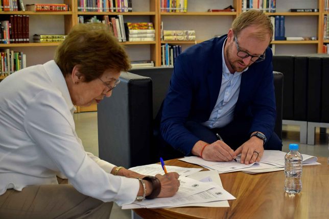 En representación de la AEL, su directora, Susana Cordero Aguilar de Espinosa, y por la UArtes su vicerrector académico Bradley Hilgert, como rector subrogante. La suscripción se realizó en la Biblioteca de las Artes, donde los firmantes y sus comitivas realizaron un recorrido guiado por Soraya Campos, directora de Servicios Bibliotecarios, y Ana María González, directora de la Sala Ría; posteriormente se trasladaron hasta el Centro de Producción e Innovación MZ14 y al campus centro de la UArtes.