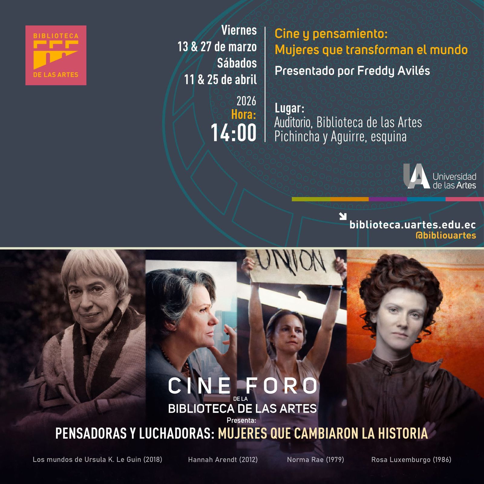 Mar 13 marzo 13 @ 8:00 am - marzo 27 @ 5:00 pm Cine y pensamiento: Mujeres que transforman el mundo Gratuito