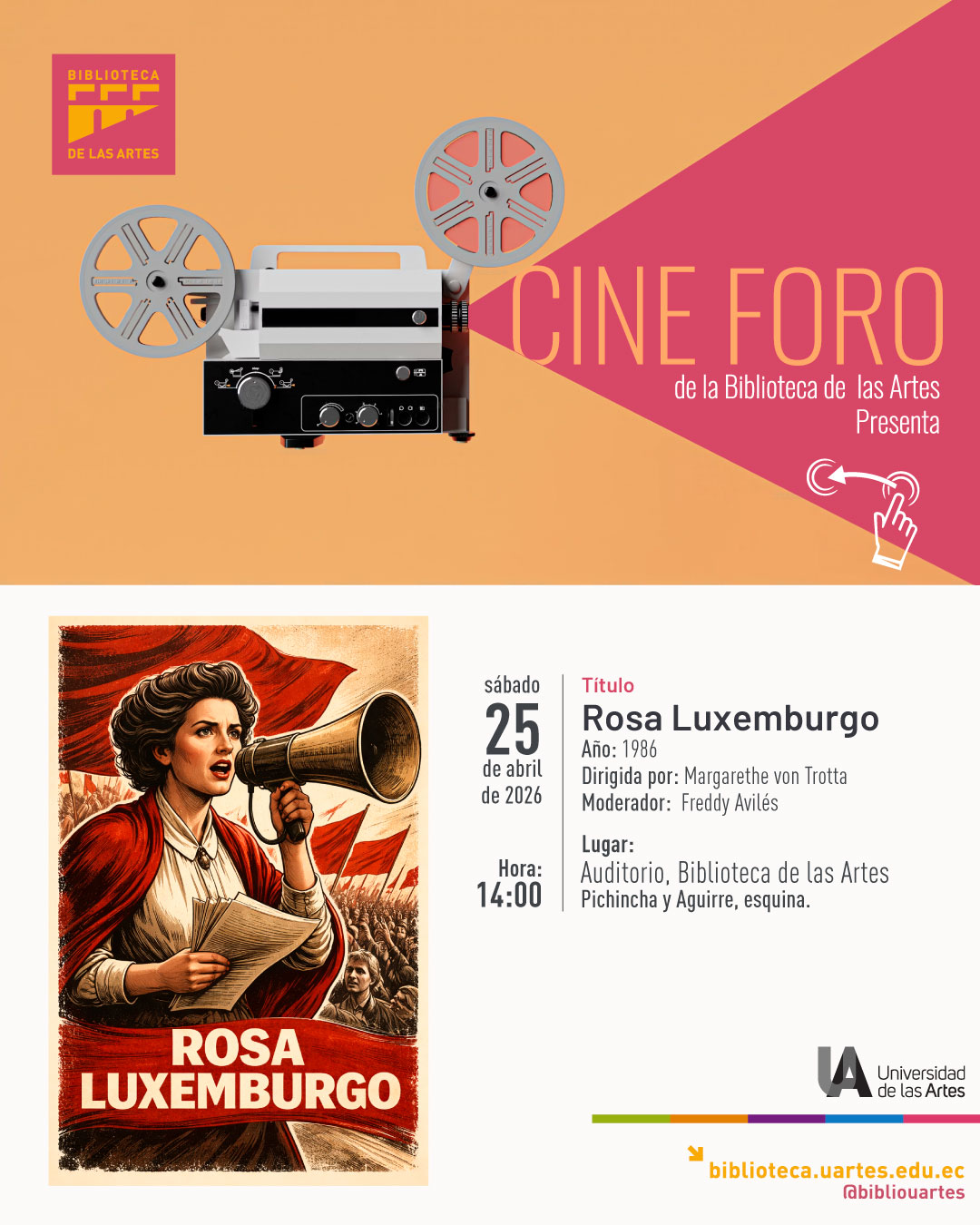 Auditorio - Biblioteca de las Artes Piso 1, Biblioteca de las Artes, Aguirre y Panamá esquina, Guayaquil, Guayas, EcuadorLa Biblioteca de las Artes te invita a una nueva sesión de cine foro, un espacio para el encuentro, la reflexión y el diálogo en torno al cine y la historia. Película: Rosa Luxemburgo Fecha: Sábado 25 de abril de 2026 Hora: 14:00 Lugar: Auditorio, Biblioteca de las Artes (Pichincha y Aguirre, esquina) Dirigida por […]