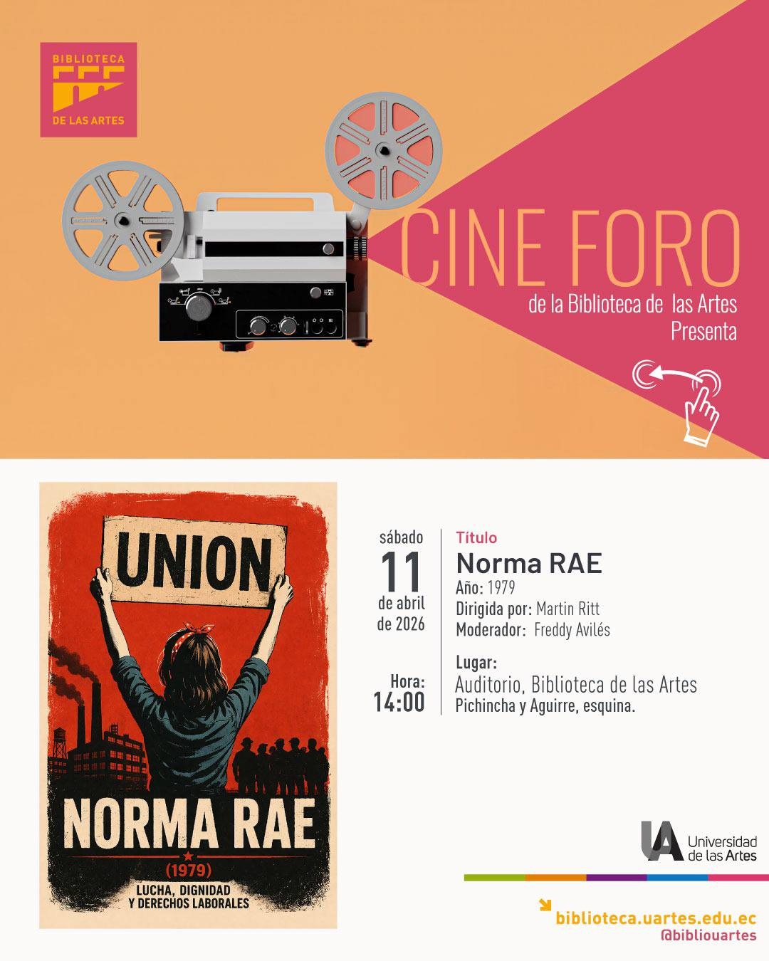 Auditorio - Biblioteca de las Artes Piso 1, Biblioteca de las Artes, Aguirre y Panamá esquina, Guayaquil, Guayas, EcuadorCine foro en la Biblioteca de las Artes Te invitamos a compartir una nueva jornada de cine con Norma Rae (1979), una historia inspirada en hechos reales que nos invita a reflexionar sobre el trabajo, la dignidad y los cambios que pueden surgir desde lo colectivo. Sábado 11 de abril 14h00 Modera: Freddy Avilés Lugar: […]
