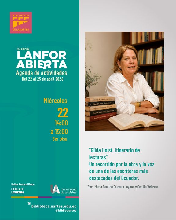 Piso 3 - Biblioteca de las Artes Biblioteca de las Artes, Aguirre y Panamá esquina, Guayaquil, EcuadorUn recorrido por la obra de la autora en la Biblioteca de las Artes, un espacio que hoy resguarda, celebra y mantiene vivo su legado. En esta actividad nos encontraremos con la literatura como espacio de memoria, diálogo y reflexión en torno a una autora fundamental de las letras ecuatorianas. Invitadas:María Paulina BrionesCecilia Velasco Literatura […]