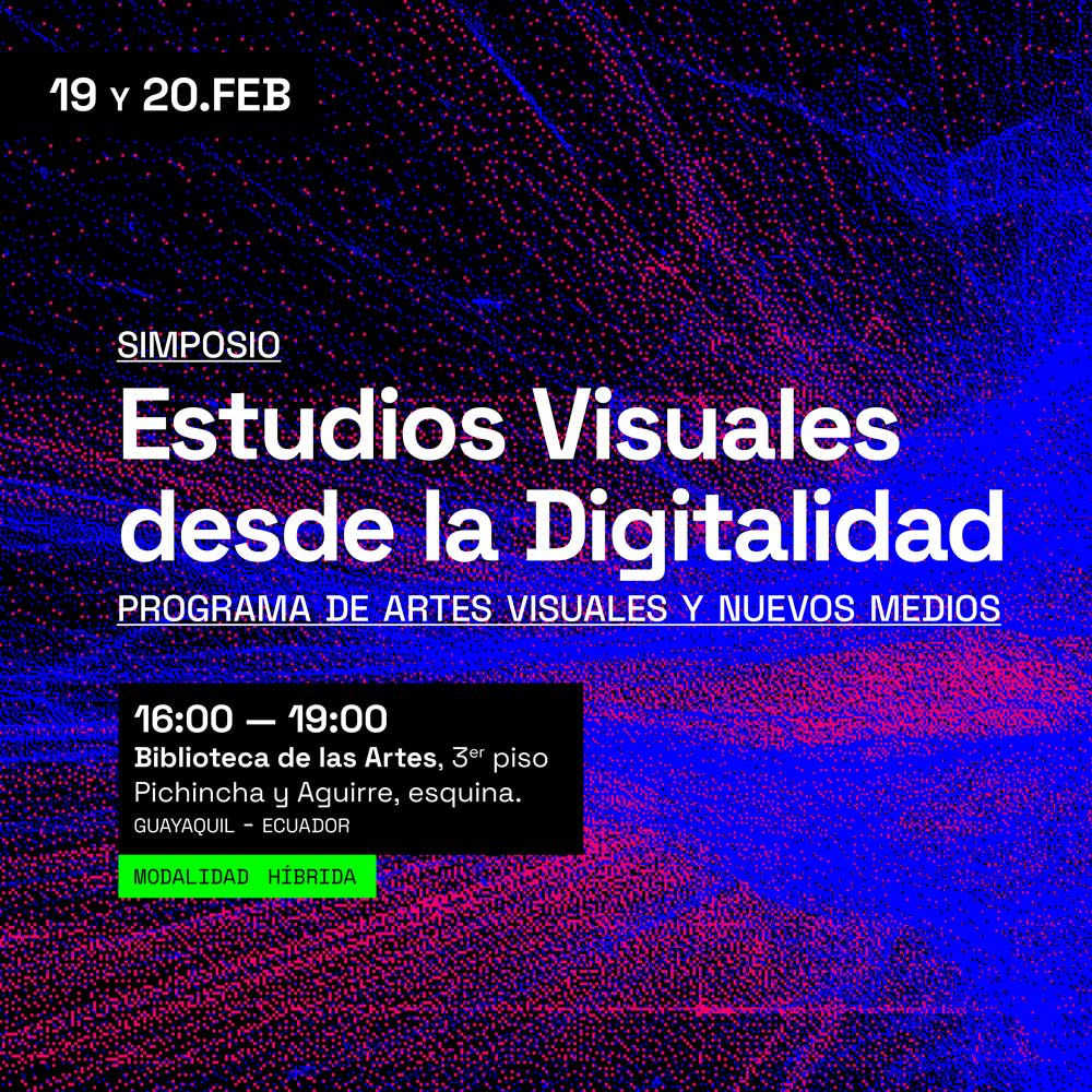 Piso 3 - Biblioteca de las Artes Biblioteca de las Artes, Aguirre y Panamá esquina, Guayaquil, EcuadorEste simposio surge del seminario de maestría “Estudios Visuales” impartido en la Maestría en Artes Visuales y Nuevos Medios, donde se analizaron críticamente las implicaciones de los medios digitales como eje central de la visualidad contemporánea. Se compone de cuatro paneles —Autoidentificación, especulación y performatividad; Datos y nuevas materialidades; Memética y viralidad; y Archivo, memoria e […]
