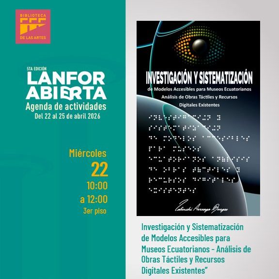Piso 3 - Biblioteca de las Artes Biblioteca de las Artes, Aguirre y Panamá esquina, Guayaquil, EcuadorTe invitamos a la presentación del libro:“Investigación y Sistematización de Modelos Accesibles para Museos Ecuatorianos – Análisis de Obras Táctiles y Recursos Digitales Existentes”Una propuesta innovadora que transforma la forma de vivir el arte Este libro es el primer registro sistemático en Ecuador de exposiciones diseñadas para que personas con discapacidad visual puedan explorar el […]
