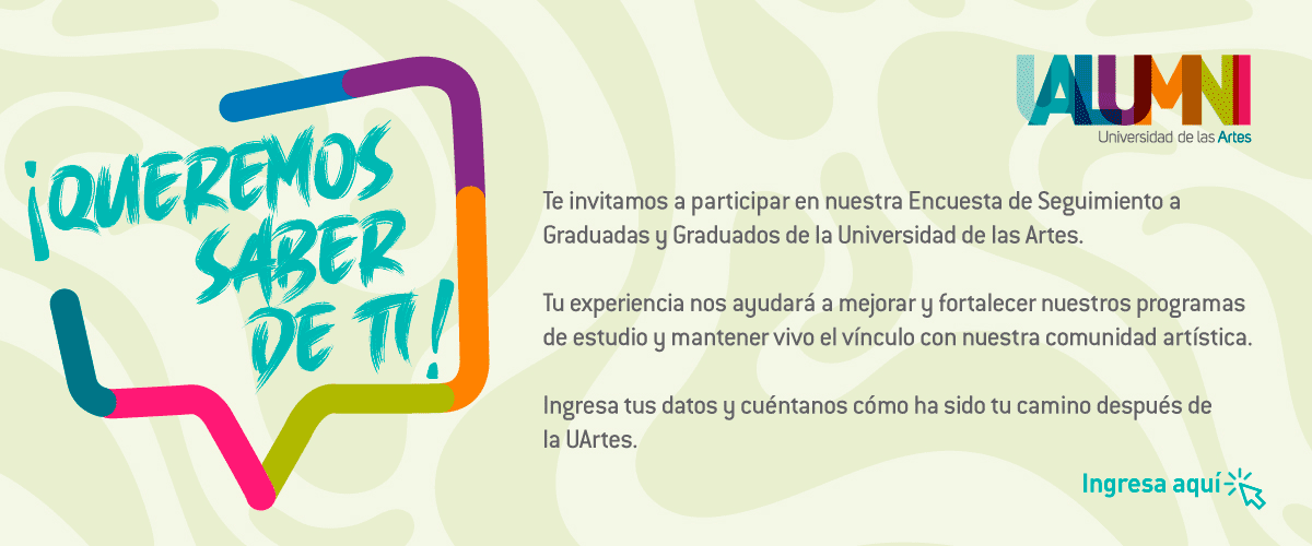 Este es tu espacio dedicado a mantener vivo el vínculo con tu alma máter y a seguir impulsando tu desarrollo profesional y artístico. Sabemos que tu trayectoria es fundamental para la Universidad de las Artes, por eso hemos diseñado este sitio para ofrecerte recursos esenciales como nuestra Bolsa de Empleo, convocatorias exclusivas, beneficios especiales, y un canal para el seguimiento de tu carrera y la participación en la Asociación de Graduados. Te invitamos a explorar las distintas secciones, a mantenernos al tanto de tus logros y a seguir siendo un miembro activo e inspirador de la UArtes.