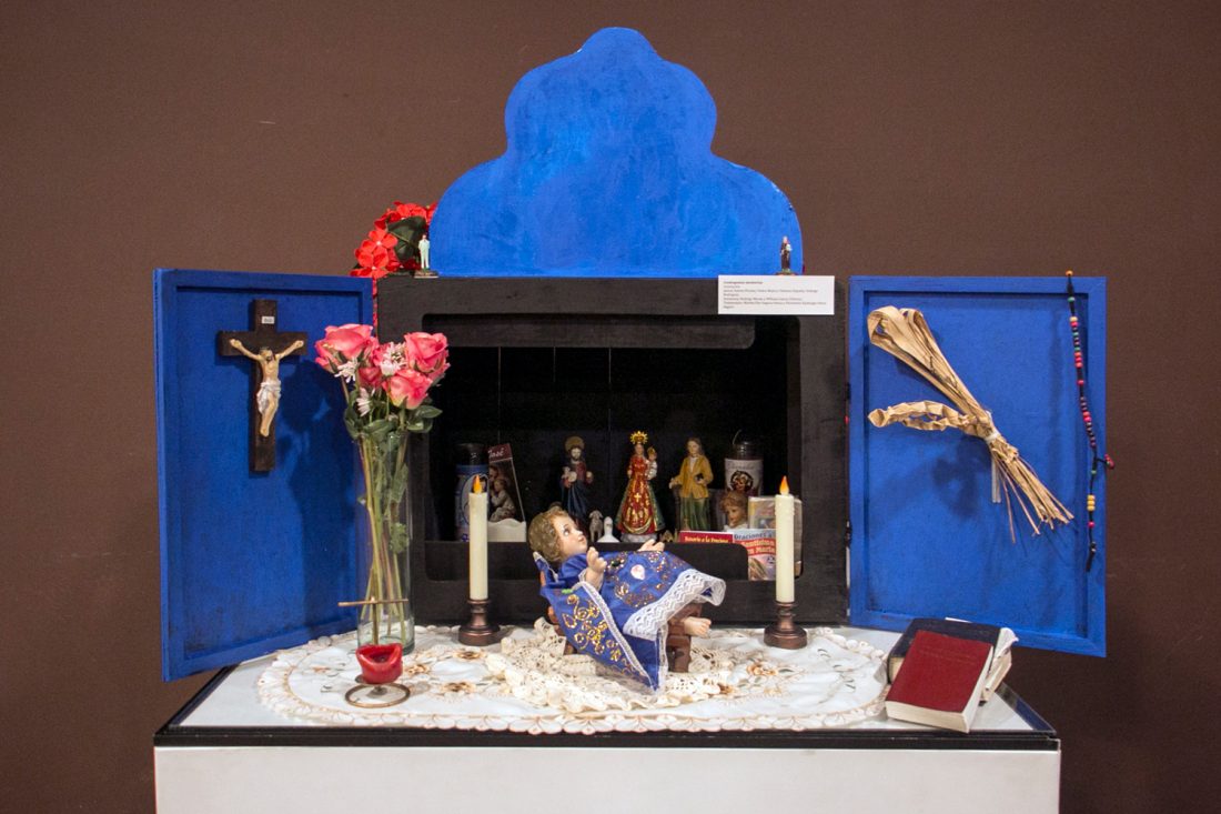 “Cosmogonía montuvia”, instalación de Janina Suárez, Pedro Mujica, Siomara España y Solange Rodríguez. La noción de archipiélago se conecta con la idea de identidades de la cultura montuvia, de aquellas poéticas que subyacen espontáneamente para cortejos amorosos. La propuesta toma en consideración los modos de vida y cosmovisión campesina del Litoral, que suelen ser expuestos en la ciudad desde una forma grotesca, simplista, que tiende a ridiculizar. “El velorio con verso” es un espacio antropológico donde se reactiva una conciencia de prácticas comunitarias y rurales, aparentemente desplazadas del imaginario citadino y con frecuencia incompatibles con una conciencia de dialéctica de progreso. La tradición oral de estas culturas deviene un legado y un puente para comunicarse con características de aquel archipiélago