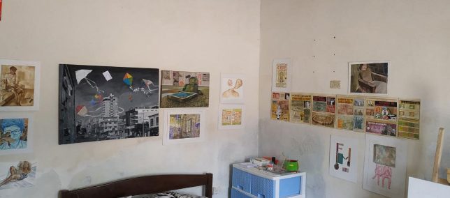 El 31 de mayo fue el turno de Harry Merchán, quien hizo un recorrido por su dormitorio (adecuado para la presentación), mientras leía el statement de su Instalación de archivo: “El punto de partida fue la apropiación de elementos: medios de comunicación, deconstrucción del capital simbólico, intervención en el espacio público, breves cuestionamientos de la educación y el estudio de mi cotidianidad ecuatoriana. Estas son usadas como detonantes para hallar información sensible acerca del comportamiento biológico del ser humano y de las ideas eurocéntricas de América Latina y las diferenciaciones de estatus social”. Comentó que lo exhibido no era solo un trabajo hecho en cuarentena, “sino una condensación simbólica de archivo resuelto por los oficios de dibujar y pintar”.