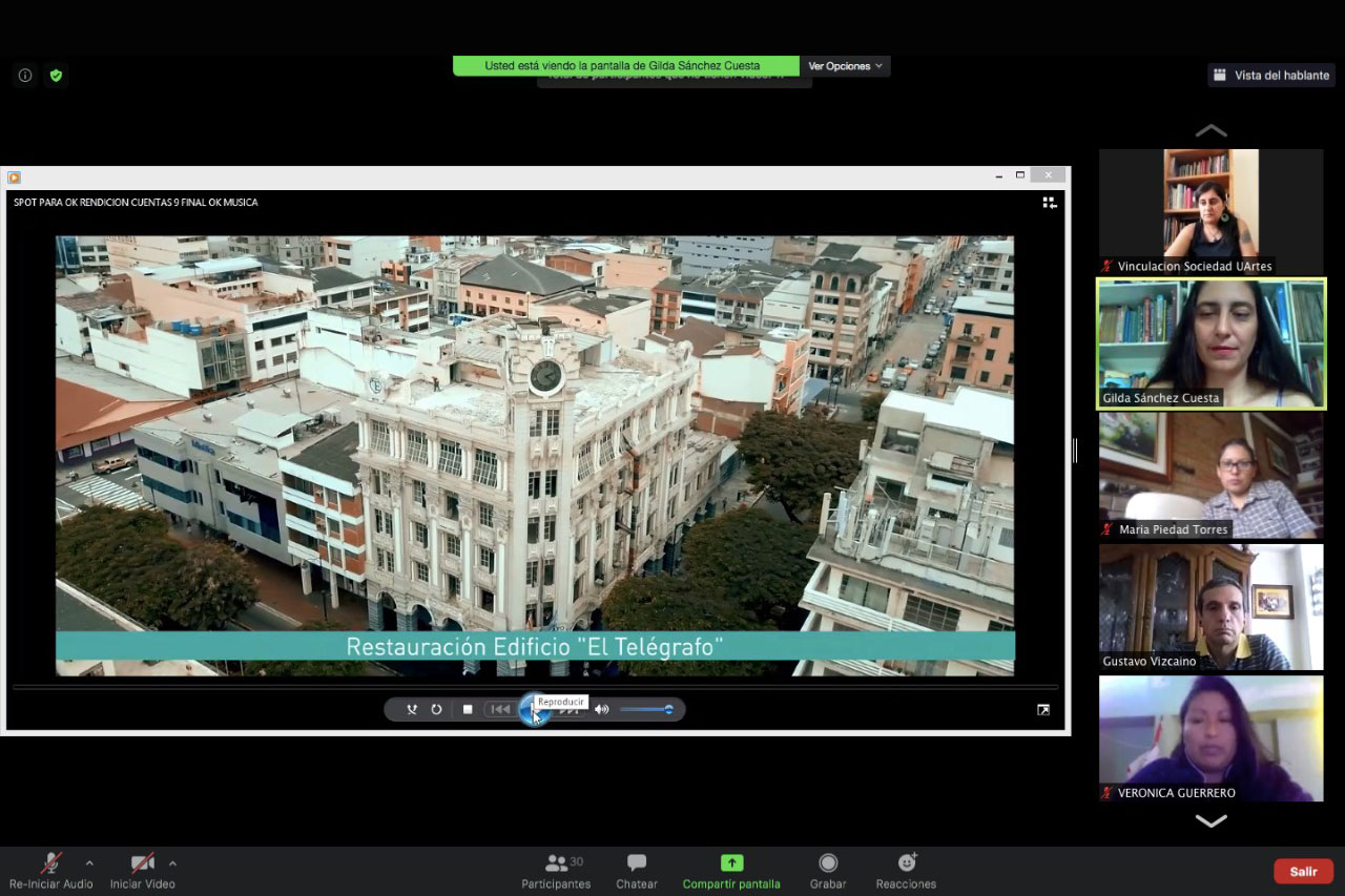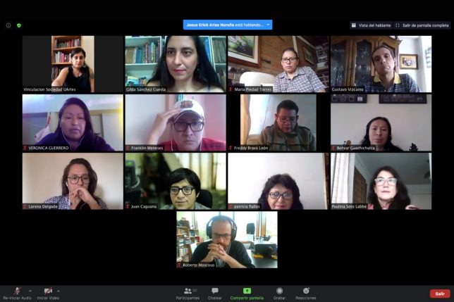 La reunión virtual contó con la participación de la rectora de la UArtes, María Paulina Soto; el director de Gestión Académica UArtes Quito, Gustavo Vizcaíno; la directora de Vinculación con la Sociedad, María José Icaza; la especialista de Educación Continua, Gilda Sánchez; los docentes UArtes que dictarán las diez asignaturas que tendrá el programa; y, 19 de los 29 profesores de los 17 colegios de artes que recibirán las capacitaciones y que provienen de las provincias del Guayas, Azuay, Chimborazo, Pichincha, Cotopaxi, Imbabura, Zamora Chinchipe, Manabí, Los Ríos y El Oro.