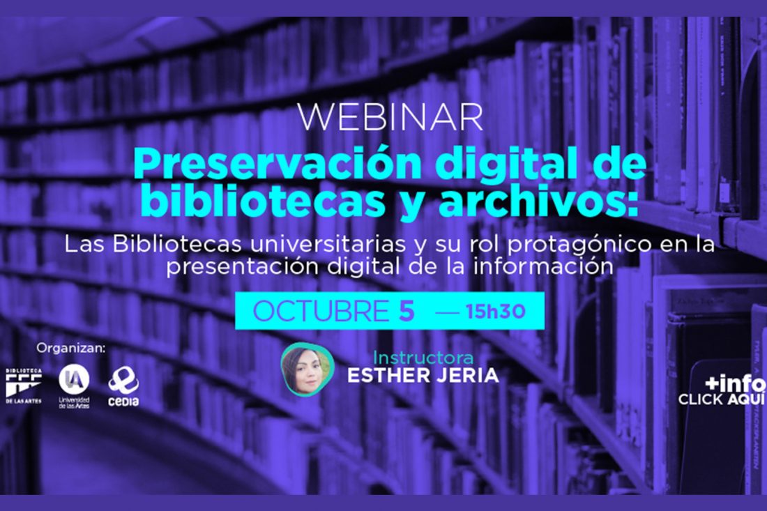 Link de registro: https://www.cedia.edu.ec/es/noticias-y-eventos/eventos/webinar-preservacion-digital-de-bibliotecas-y-archivos-las-bibliotecas-universitarias-y-su-rol-protagonico-en-la-presentacion-digital-de-la-informacion