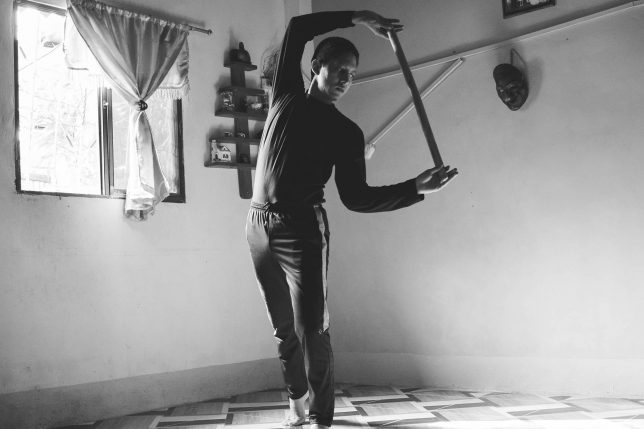 El proyecto se realizó en un lapso de seis meses, aproximadamente (entre abril y septiembre de 2020). “Como el trabajo fue el desarrollo de una secuencia de training, a nivel práctico conté con la herramienta que hace parte del entrenamiento, que es un palo de 75cm con el que se realiza la secuencia. El espacio para crear y entrenar fue la sala de mi casa y para el registro conté con mis equipos de tecnología: cámara semiprofesional, trípode, material de audio y edición. Para el desarrollo del trabajo escrito que acompaña el producto artístico conté con una serie de fuentes bibliográficas que me sirvieron para sustentar el proyecto. Tuve, asimismo, la colaboración de varios artistas, creadorxs, directorxs (Gabriel Torres, Santiago Carcelén, Wilson Pico, Pilar Aranda, Gerson Guerra) que me brindaron entrevistas y enriquecieron mi trabajo”.