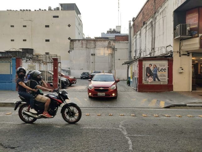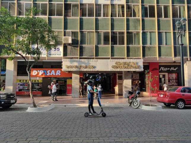 El Cine Aladino, en la calle Baquerizo Moreno, también se convirtió en un parqueadero. En este momento me doy cuenta de que llevo mi chompa puesta en pleno centro de Guayaquil. Para suerte de todos fue un día nublado y el calor se guardó un momento para permitirnos recorrer la Ruta Sin Cine y Sin Sol d. C.