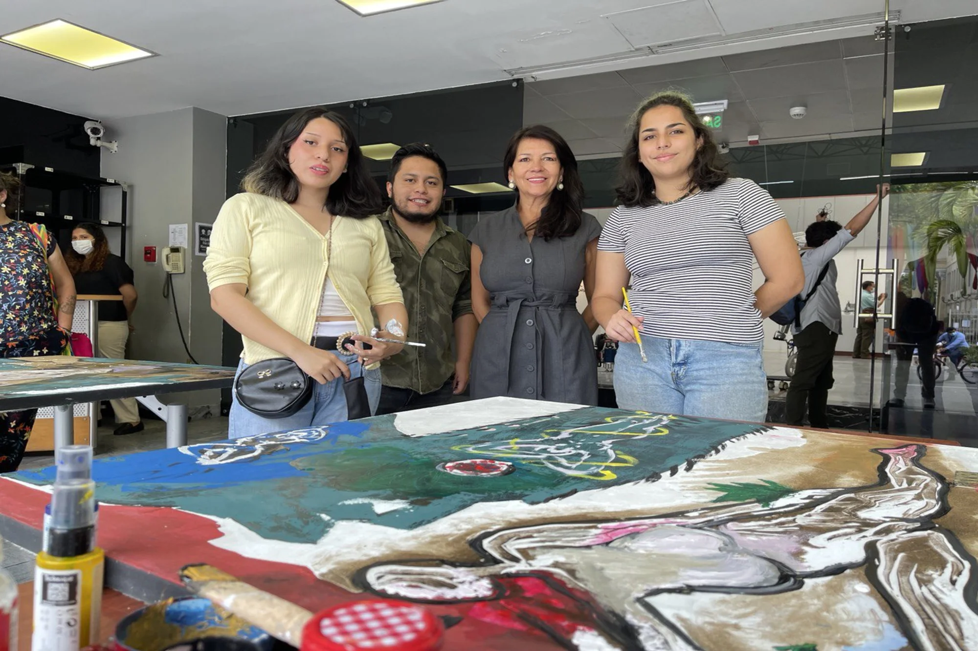 Katherine Erazo, Cristina Avellán y Brayan Herrera acudieron expectantes a la cita. Ellos cursan el cuarto, quinto y sexto semestre del itinerario de Pintura en la Escuela de Artes Visuales de la UArtes, y estuvieron entre los estudiantes que respondieron a una convocatoria que hizo la artista plástica Rosy Revelo para realizar una obra colaborativa en los exteriores del Museo Nahim Isaías.