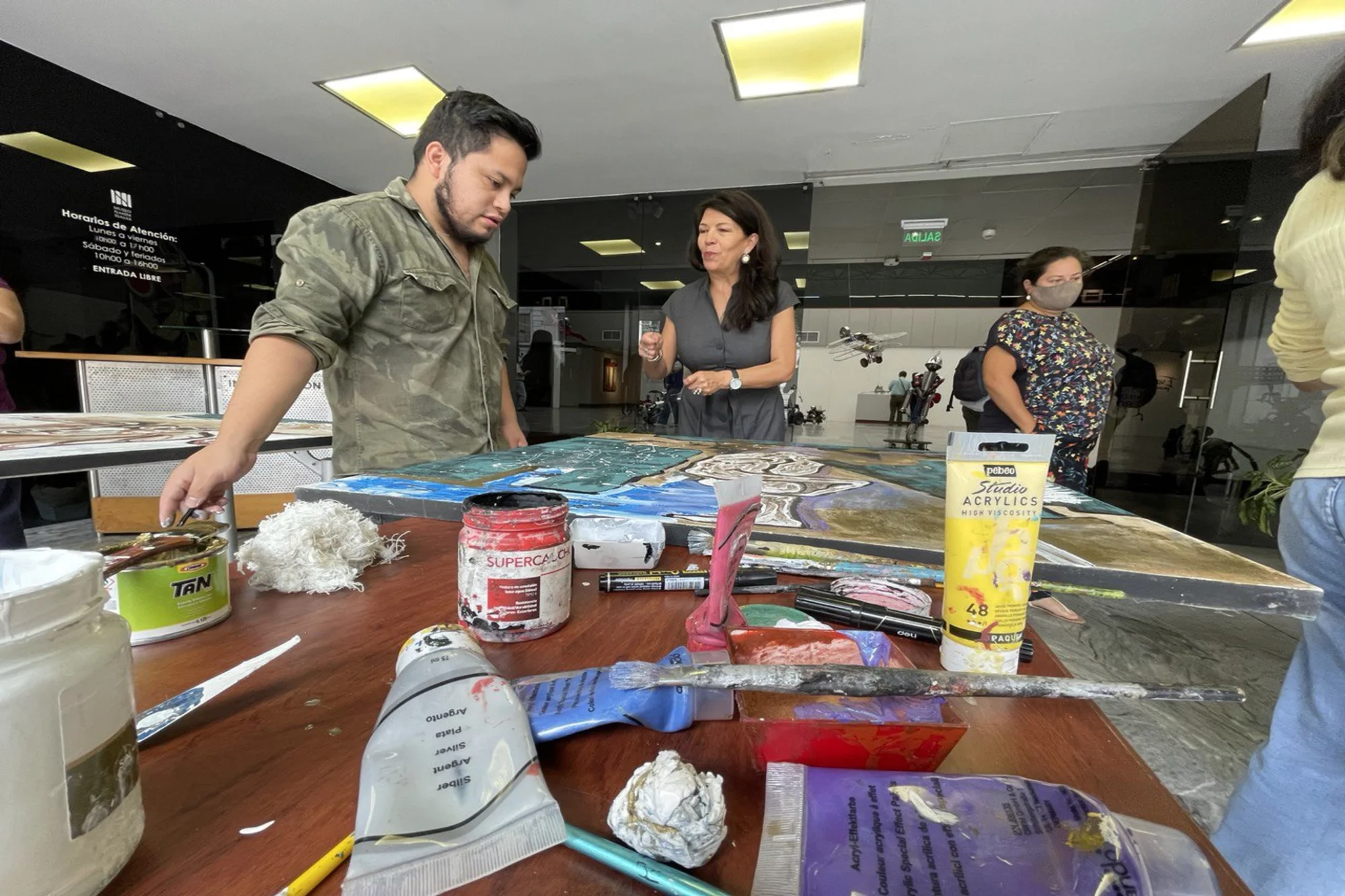 Junto con los estudiantes UArtes, en uno de los lienzos del tríptico también participó Cuty Espinel, directora del Museo Nahim Isaías, compartiendo la experiencia del trabajo colaborativo. Rosy Revelo dio entonces la voz de alerta, pues estaba lista para guiar la visita por su exposición. Katherine, Cristina y Brayan hicieron un alto e iniciaron el recorrido.