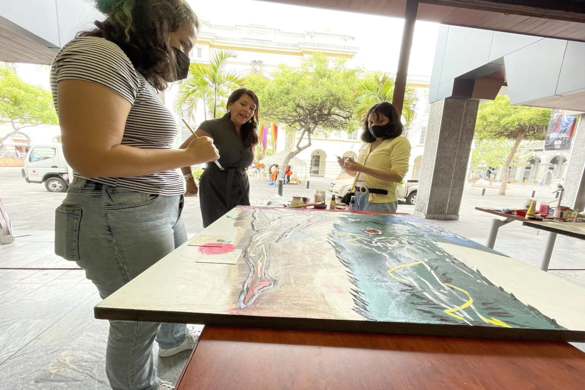 Es en ese contexto que se propuso revisar, intervenir y proponer una obra con los estudiantes de la UArtes, un trabajo comunitario, al aire libre, con gente de nuestra institución de educación superior, con quienes visitan la muestra “e incluso con los transeúntes que se permitan visibilizar cómo la mujer habla con voz propia, con palabras, con trazo, con línea, con imagen, con color, con presencia; aquella que crea y deja huella”.
