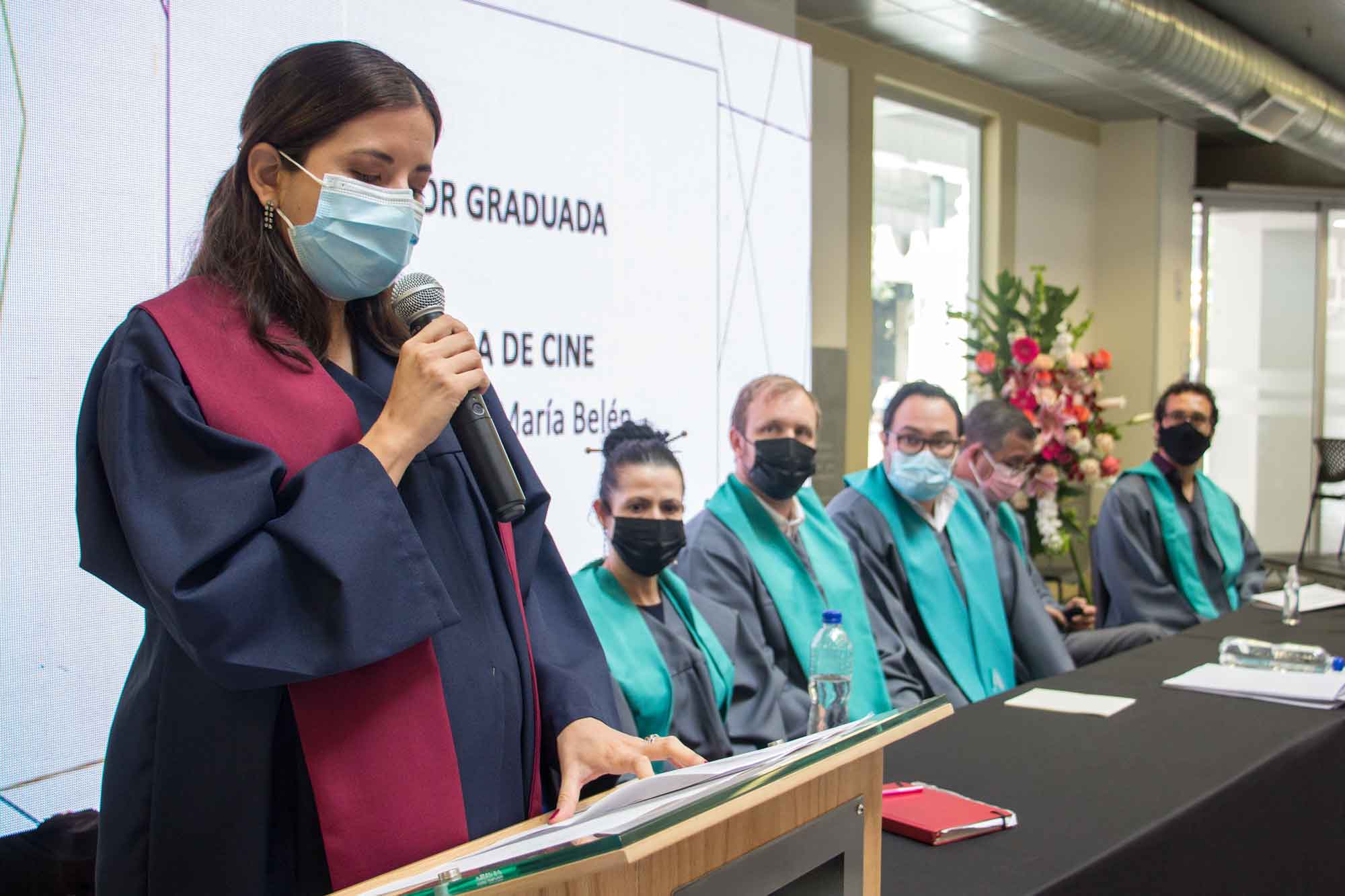 “Ahora, en mi ceremonia de graduación, con mucha seguridad les puedo decir que no hay fecha de vencimiento para reinventarnos como artistas (…). En este día que experimentamos la sensación de un comienzo, los invito a pensar que cada día es una segunda oportunidad para hacer las cosas diferentes (…). Para muchos, graduarnos en esta complicada época de emergencias y carencias, que nos llevó a cambiar de ciudad o modificar los proyectos de tesis nos puso en condiciones adversas, de las que aprendimos a adaptarnos y lograr nuestros objetivos. Sintámonos orgullosos del logro que celebramos hoy, sinceramente los felicito y nunca dejemos de hacer películas ni en tiempos desfavorables”.
