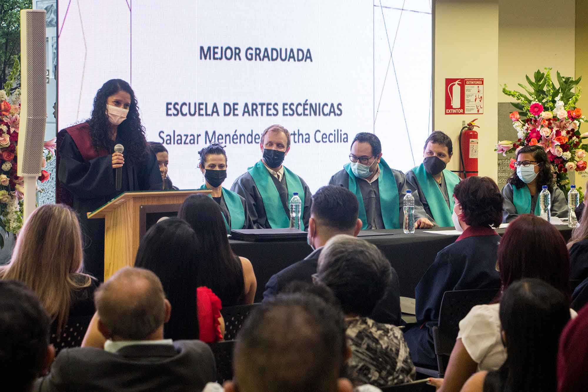 Por la carrera de Creación Teatral, Cecilia Salazar, quien obtuvo el más alto puntaje a lo largo de su preparación académica en la UArtes, pronunció un discurso igualmente emotivo, sin dejar de lado la espontaneidad de sus puestas en escena, de su transitar como payasa con su nariz roja. Ella señaló: “Me gustaría resumir esta celebración de logros y triunfos en una sola palabra: Gratitud…, gratitud porque tenemos el privilegio de estar aquí en medio de un contexto pandémico. Agradecer a Dios y a la vida que seamos parte de los sobrevivientes y que podemos seguir escribiendo nuestra historia. Agradecer a la Universidad de las Artes por darnos la oportunidad de forjar un futuro y luchar por nuestros derechos… Agradecer a quienes conforman cada departamento de la UArtes, desde el que nos recibe en la puerta, el que nos tenía las aulas limpias, los técnicos y administrativos, todos los que, de alguna u otra forma, nos apoyaron. Sigamos manteniendo esa calidad humana y empatía que fortalece a la comunidad universitaria en todos sus espacios”.