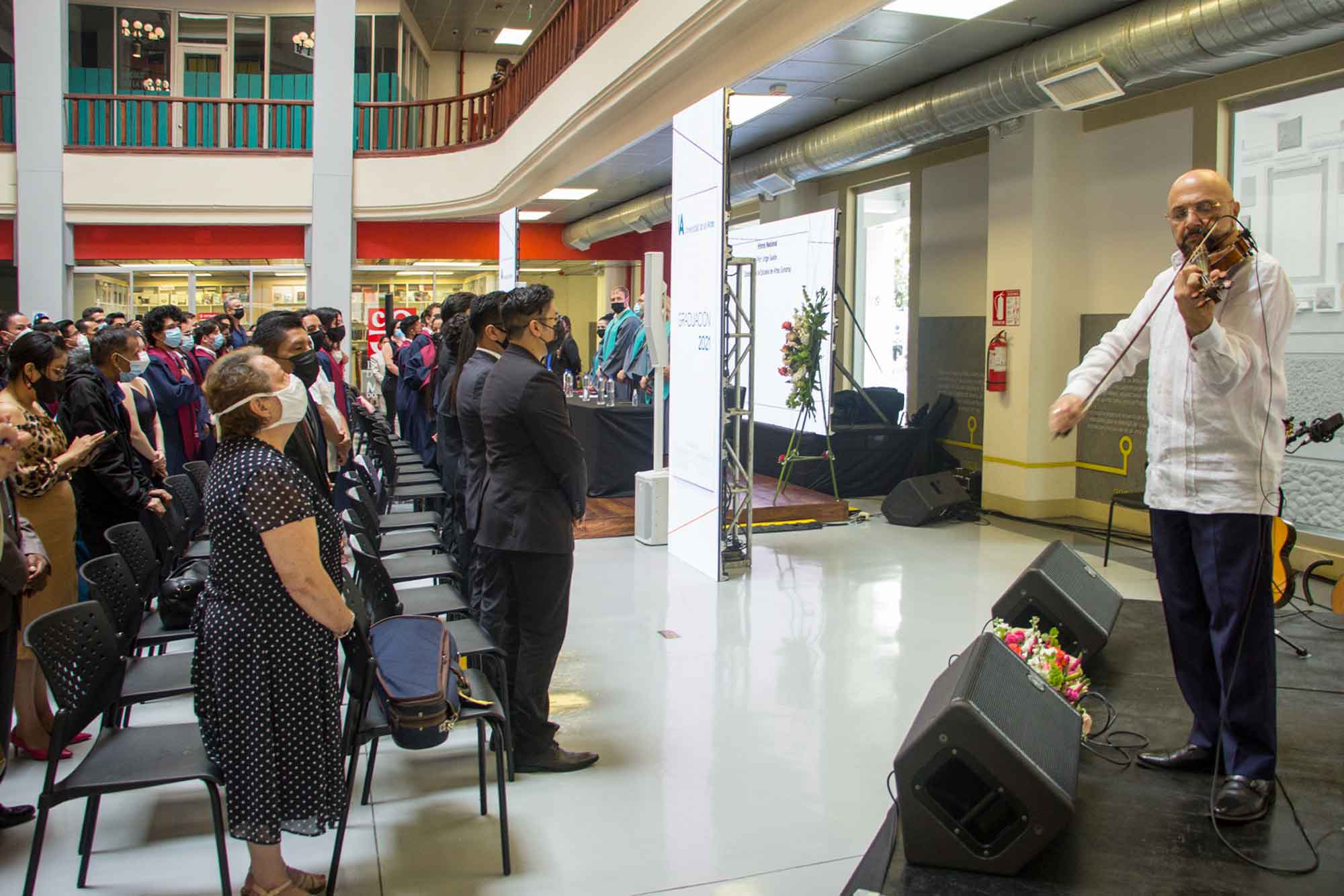 La interpretación que el reconocido violinista Jorge Saade, hoy docente de la EAS, hizo del Himno Nacional, marcó el inicio del acto. Al Vicerrector Académico le correspondió dirigirse a los graduados, lo cual calificó de un gran honor y resaltó la importancia del momento para quienes recibirían sus títulos, para la UArtes, para los amigos y familiares, para la sociedad entera. “Nos enorgullece enormemente investir a los graduados y enviarles a la sociedad, porque es una fiel muestra de que estamos cumpliendo con nuestra obligación de brindar al país una educación pública en artes de calidad, pertinente y gratuita”.