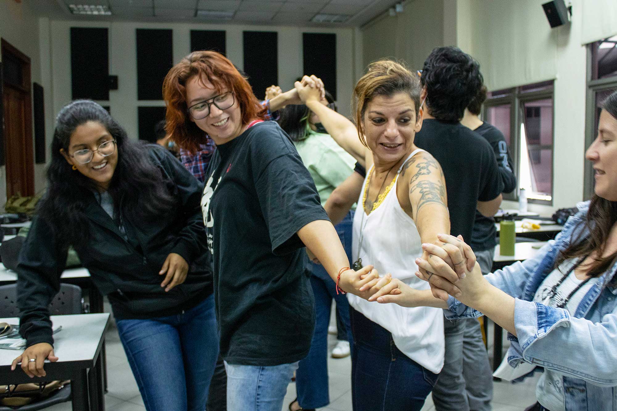 En imágenes, la principal corresponde a la tallerista CEAT Daniela Zambrano, quien participa en dinámica lúdica con la docente Libia Pérez y estudiantes UArtes durante su clase de Transversal.
