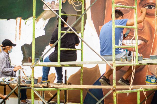 Los estudiantes que realizaron el mural fueron Kevin Caita, Damaris Vite, Joselyn Álvarez y María José González, con la asistencia de Dandy Intriago, María Belén Reyes, Jackeline Salazar y Ambar Vera. El proceso fue documentado por Bryan Cedeño, Duval Bajaña, Richard Ubidia y Christian Duche. Todos de la Escuela de Artes Visuales de la UArtes. Con ellos, Gregory Lynch, alumno de Artes Sonoras, quien intervino musicalmente en la sesión inaugural.