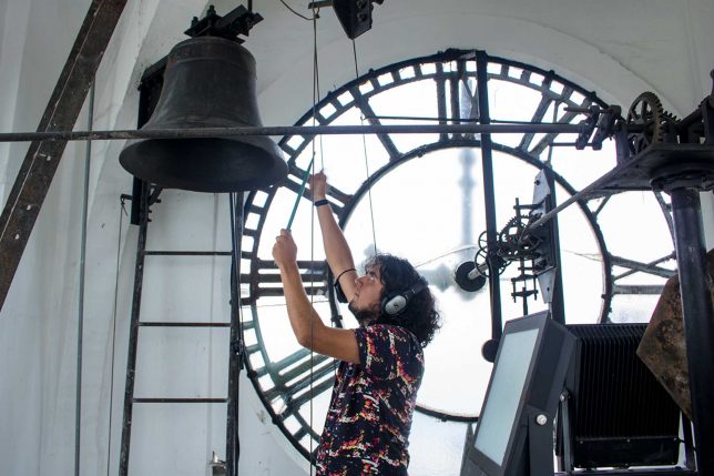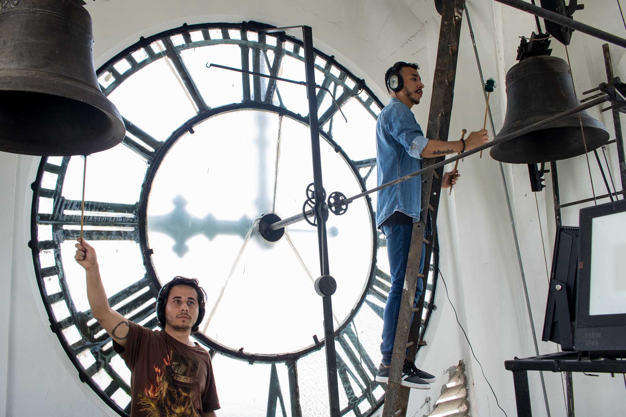 Ripalda contó que la intervención electroacústica del campanario de El Telégrafo era el resultado de un proyecto previo y una exploración en torno a las campanas del patrimonial edificio, donde originalmente funcionó el periódico del cual tomó su nombre. Hace dos años y antes de que se repararan hicieron mediciones de las notas con Luis Barrie, un ingeniero acústico que vino de Chile. Así determinaron qué notas daban las campanas, qué melodías, cómo era el funcionamiento y cuántos años tenían. Producto de eso surgió la idea de hacer un concierto de campanas, como los que hace el musicólogo y artista sonoro español Llorens Barber en varias ciudades. “La intención es recuperarlas, reimaginarlas y reapropiarlas fuera de su contexto original que era dar la hora y tocar su clásica melodía”, anotó el docente.