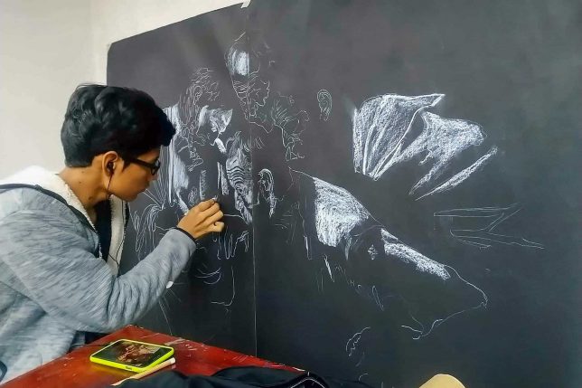 Su participación fue anecdótica. La obra en concurso, a la que tituló “Introducción a la cancha de tierra” y trabajó en acrílico, grafito, acuarela y lápiz de color, la concibió como una propuesta híbrida de dibujo y pintura totalmente opaca sustentada en una investigación sobre educación y hogar, que inició en la asignatura Poéticas Visuales 1, dictada por el docente Marco Alvarado.