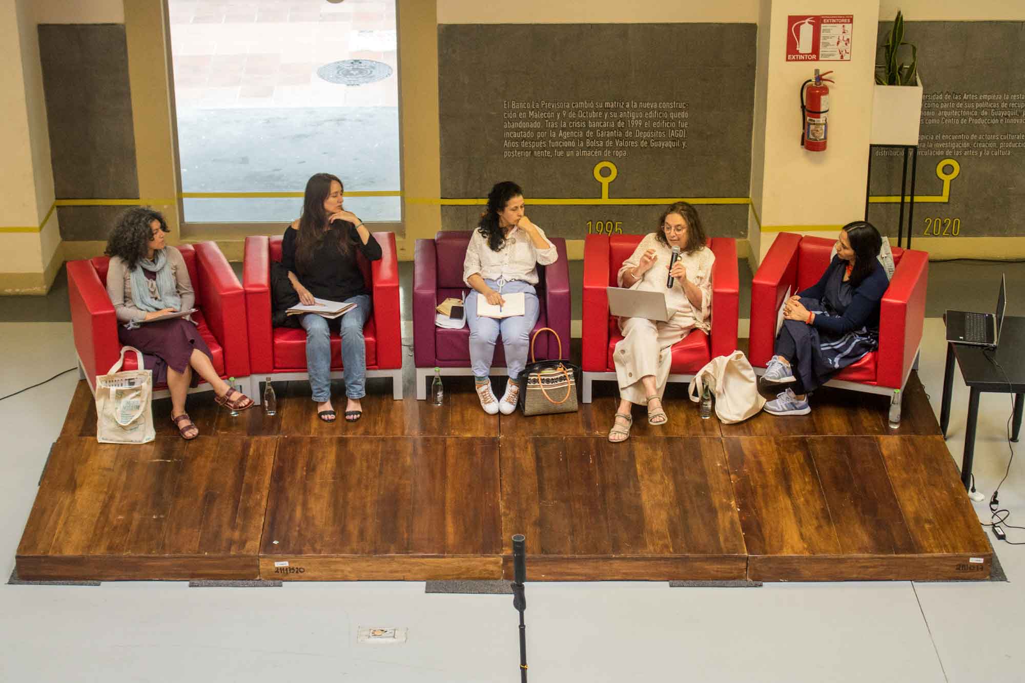 En el segundo día de actividades del 7mo. Encuentro Iberoamericano de Arte, Trabajo y Economía, el miércoles 19 de octubre, se realizó la mesa de diálogo “Reconocernos”, en la Plaza Pública del MZ14 de la Universidad de las Artes. Moderada por la doctora Olga López, nuestra vicerrectora de Posgrado e Investigación en Artes, en ella participaron Alma Espino, economista feminista e invitada internacional; María Fernanda Troya, doctora en Antropología Social, profesora investigadora de la FLACSO e integrante del equipo curatorial del 7EIATE; María del Pilar Gavilanes, doctora en Artes y Lenguajes y docente UArtes, y Tania Navarrete, doctora en Ciencias Administrativas y directora del Centro de Producción e Innovación MZ14.