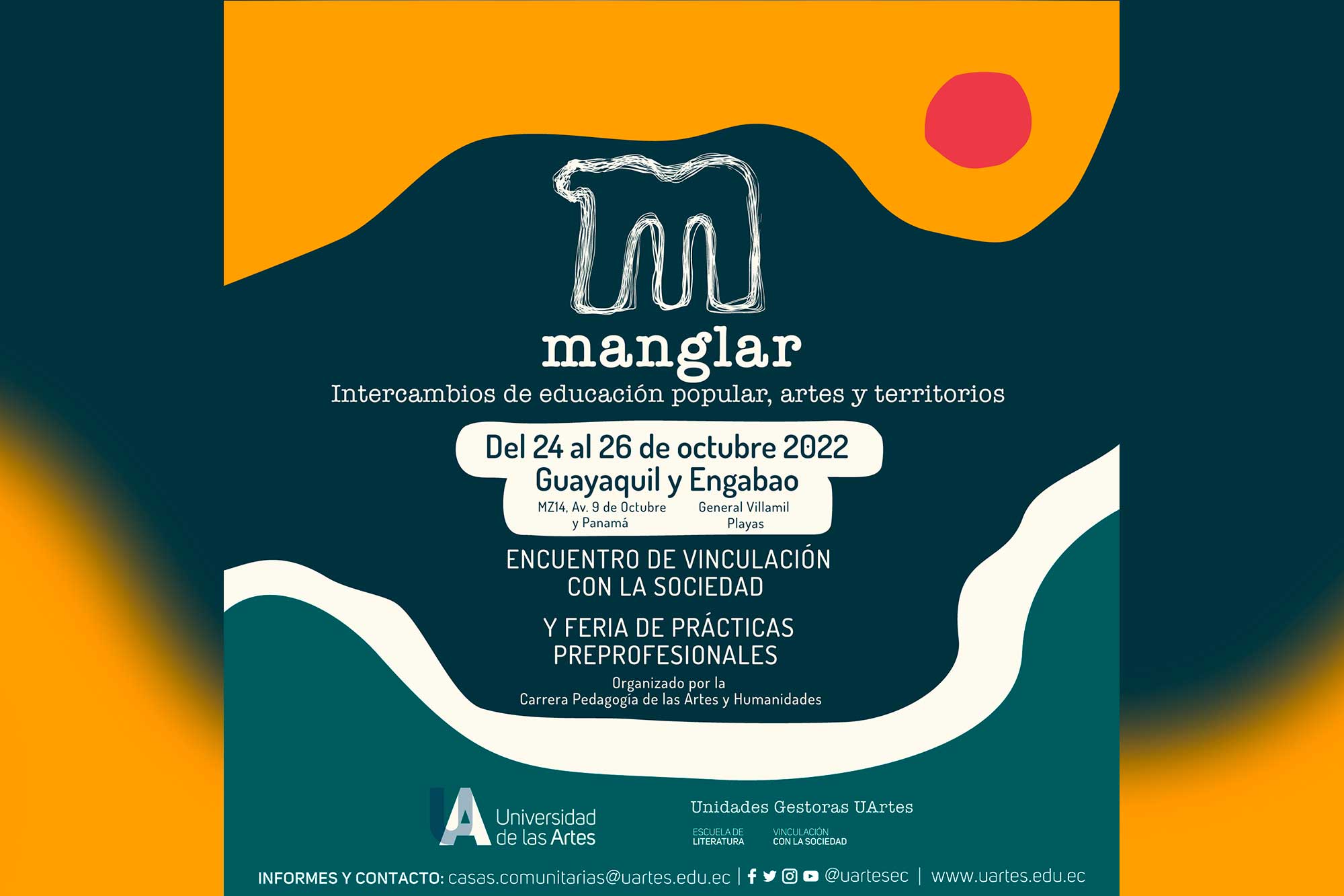 Del 24 al 26 de octubre se desarrollará “Manglar: Intercambios de educación popular, artes y territorios”, una propuesta interdisciplinar de la Universidad de las Artes que pretende articularse con organizaciones, colectivos, movimientos socioculturales, educadores/as, artistas y gestores/as locales, nacionales e internacionales. En la jornada inaugural y como mesa de apertura se hablará sobre la “Vinculación con la sociedad y calidad de la educación superior”.