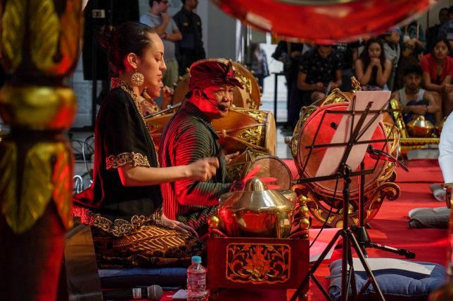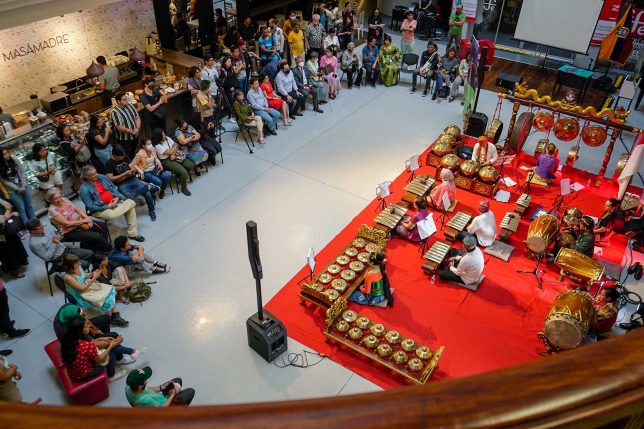 El equipo cultural de la Embajada de Indonesia fue el encargado de interpretar el Gamelán con un repertorio de nueve canciones nativas, pero también se incluyó el tema latinoamericano “Moliendo café”. La presentación concluyó con una danza a la diosa de la prosperidad por la fertilidad y la abundancia.