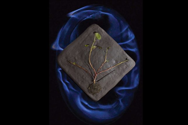 “En el primero vemos una maleza atrapada en el suelo y rodeada de fuego azul que hice con alcohol (que aún conservo debido a la pandemia). En el segundo mostramos un panorama diferente, una maleza protegida, rodeada de dibujos de luz que le dan esperanza. Rescaté esta yerba y al igual que las burbujas que guardan el aire que da vida tiene un espacio redondo que la protege, actualmente se encuentra en un lugar seguro. En el tercero está completo y eternizado. El espacio que la protegía, en este momento, la rodea y la complementa, ya no están separados, ni lejos. Su existencia es completa”.