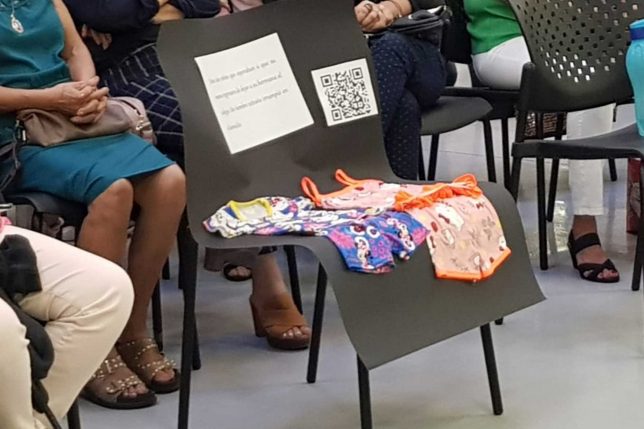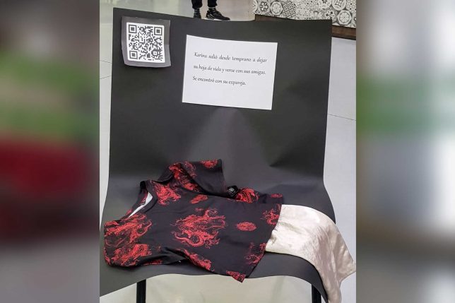 No había personas sentadas en ellas. Pegados en los espaldares se leían las impresiones de leyendas que registraban las historias de muerte y violencia de las que fueron víctimas Andrea, Verónica, Lisbeth, Nancy, Kerly, Karina del Pozo y María Emperatriz, y dos niñas cuyos nombres se omitieron. Allí se habían colocado también vestimentas femeninas, en un simbolismo de dolorosas ausencias.