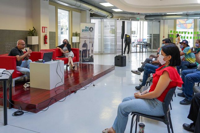 El coordinador de la maestría de Escritura Creativa, Mgs. Miguel Aillón, intervino como moderador de la cita, a la que asistieron el rector de la UArtes, William Herrera; la directora de la Escuela de Posgrados, Diana Medina; docentes, estudiantes, administrativos y público en general.