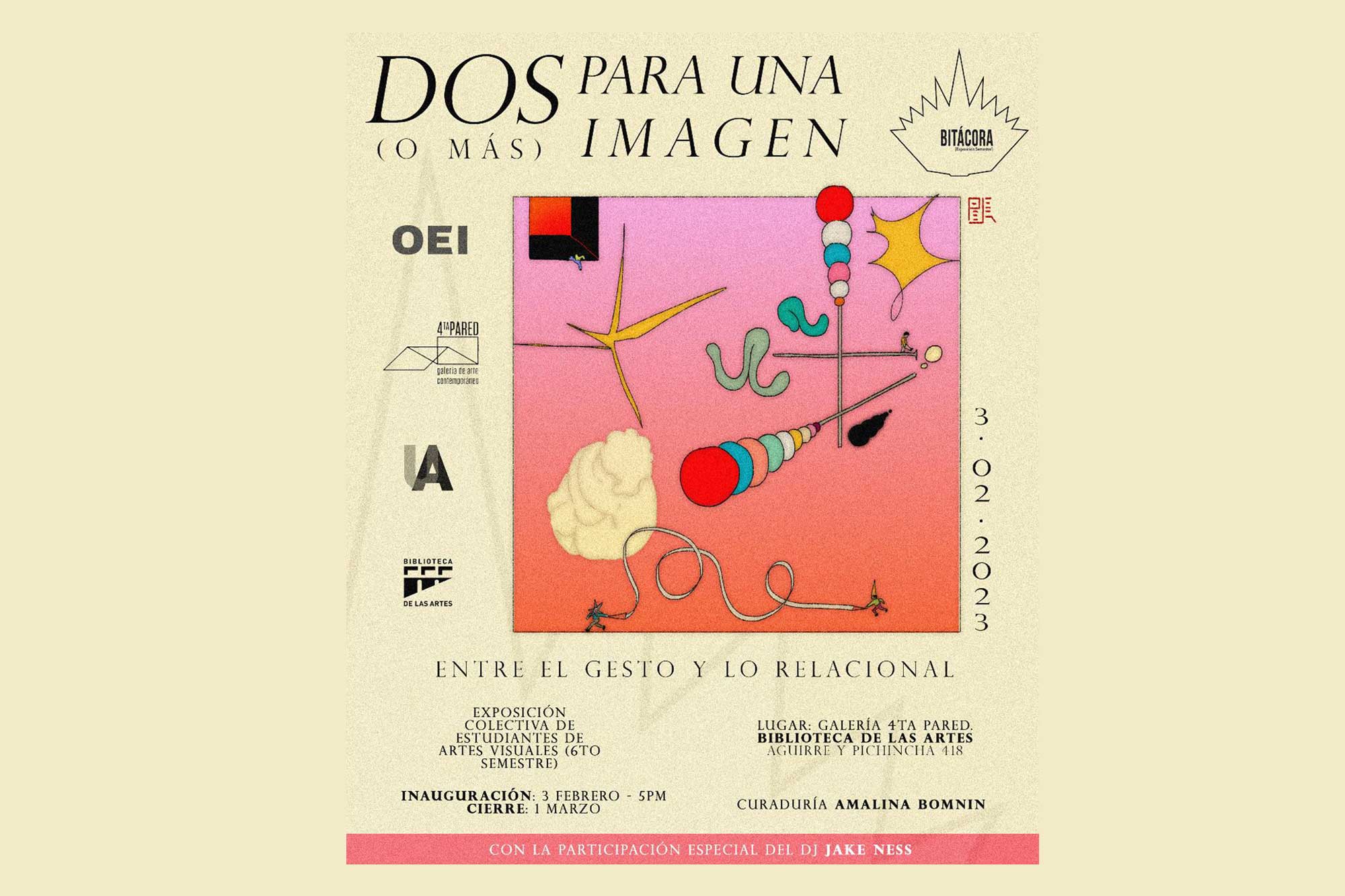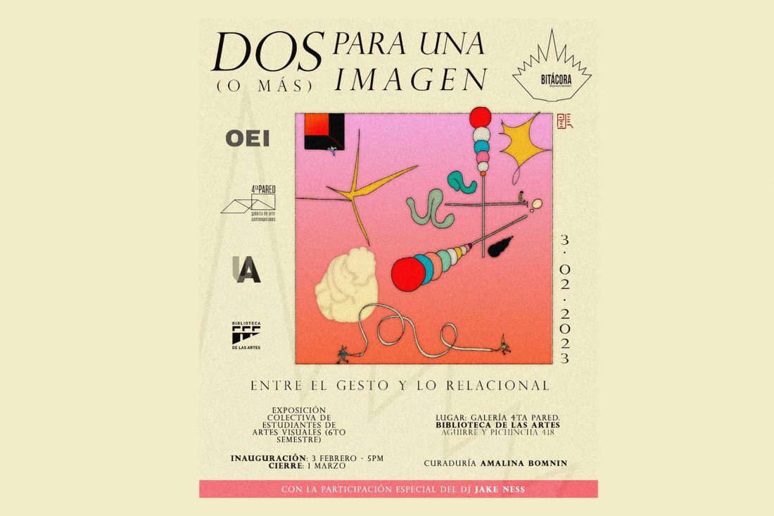 En la Galería 4ta. Pared de la Biblioteca de la Artes se inaugurará el próximo 3 de febrero de 2023 la exposición colectiva “Dos (o más) para una imagen: entre el gesto y lo relacional” de los estudiantes de sexto semestre de la carrera de Artes Visuales, desarrollada dentro de la asignatura Arte y Pensamiento Contemporáneo que dicta la MSc. Amalina Bomnin. La docente es su curadora y comparte con InfoUArtes reflexiones acerca de la propuesta expositiva: