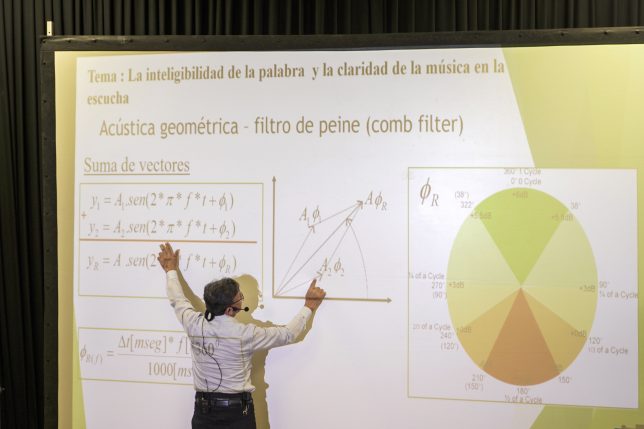 Magistral fue la charla que seguidamente dictó Pedro Segovia acerca de la “Inteligibilidad de la palabra en la escucha”, en la Sala de Experimentación Sonora. Se dio entonces la residencia artística de La Banda Brava, en el Estudio A, y paralelamente, en el Estudio B, Andrés Noboa ahondó en “La instrumentación en el proceso de producción”.