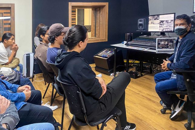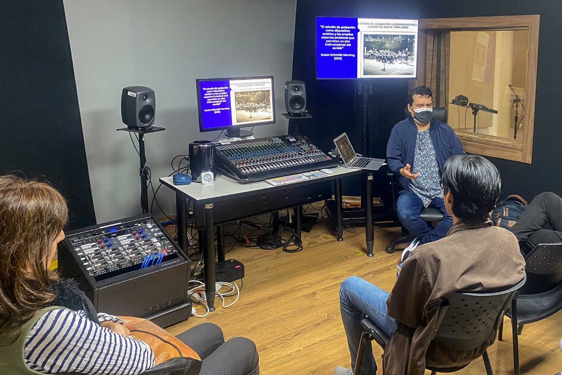 “Aprovechen los espacios que tienen para que puedan explotar todo su potencial” fue la recomendación que Caballero hizo a quienes asistieron a la charla, en especial a los estudiantes de la EAS, en su proceso de aprendizaje y profesionalización, y en referencia a los estudios de grabación A y B con los que cuenta la UArtes.