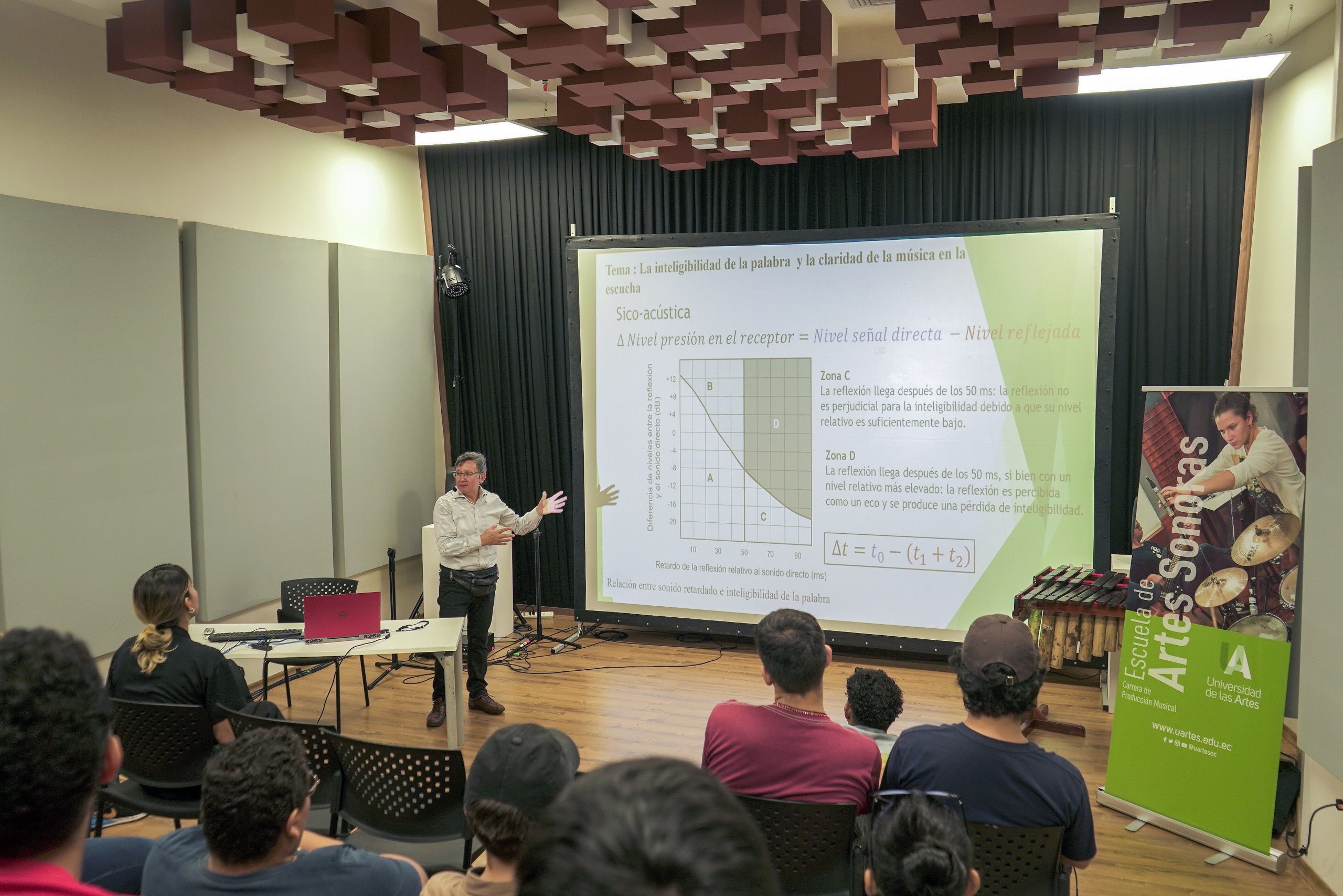 En muchos de los casos la música se maneja de manera subjetiva, pero en su trabajo, y con una experiencia ya de 40 años, ha buscado entender cómo hay que manejarse en lo entendible e inteligible. El académico Pedro Segovia, ingeniero electrónico y máster en Acústica Arquitectónica y Medio Ambiental, lo dijo en la charla “La inteligibilidad de la palabra en la escucha” que dictó este 9 de mayo, en la jornada inaugural de las VI Conferencias de Audio y Sonido del Ecuador CASE 2023, organizada por la Escuela de Artes Sonoras de la Universidad de las Artes.