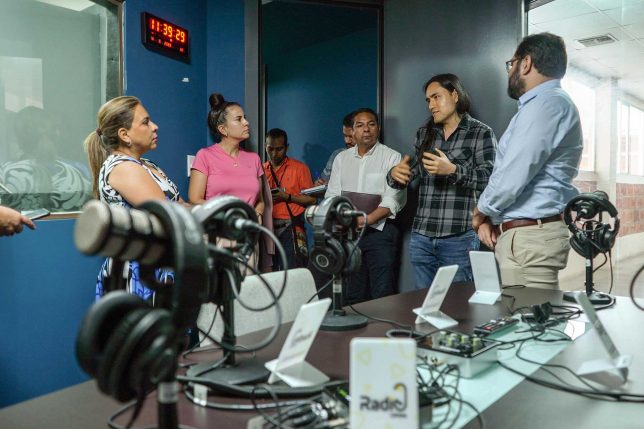 El proceso de profesionalización de los estudiantes UArtes y sus procedencias fueron algunas de las inquietudes que expresaron los visitantes en el trayecto hacia los estudios de grabación de la Escuela de Artes Sonoras, donde el doctor Herrera indicó que son utilizados desde el 2018, en que se registró la primera generación de graduados. Están dotados con equipos de primer nivel, proporcionando un tratamiento acústico profesional, expresó.