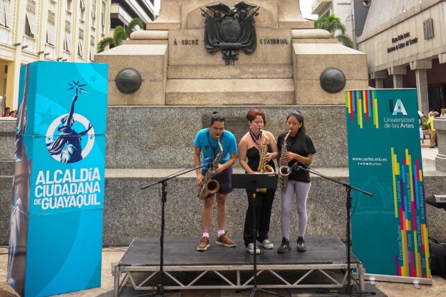 Así, entre los exponentes estuvo en el escenario de Open Maic, ubicado de cara al Malecón Simón Bolívar, Luis Andrés Hinojosa de la Escuela de Artes Sonoras, quien brindó con su saxofón una pieza libre de funk y también compartió con dos compañeras de la carrera de Artes Musicales, Nathali Chica y Madeline Chicaiza, el pasillo “Guayaquil de mis amores”.