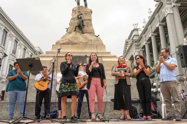 Así como la música se tomó el espacio público, la poesía también lo hizo. Estudiantes de la Escuela de Literatura leyeron varios de sus poemas, mientras que la docente y escritora Siomara España perennizaba en un video el momento. “Estamos con las y los estudiantes del taller de poesía. Estos son espacios ciudadanos y democráticos y me parece sumamente importante que ellos (alumnos) puedan mostrar lo que hacemos en la escuela y la universidad en pro de la cultura y la inserción social que necesita la cultura y el arte en Guayaquil”, expresó.