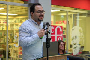 El rector habló de la inauguración de una biblioteca comunitaria en el barrio Cisne 2 de la Isla Trinitaria, efectuada el fin de semana anterior, posible gracias a un proyecto de vinculación de la UArtes en trabajo conjunto con las comunidades. “Esos espacios e iniciativas también nos conducen a hablar de estos temas fundamentales para la sociedad ecuatoriana y, sobre todo, en una coyuntura electoral como la que estamos viviendo. Tenemos que hablar mucho más de educación, de educación pública, de servicios y derechos culturales, de infraestructuras culturales”.