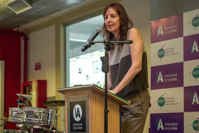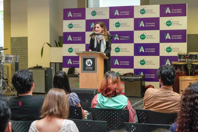 Sara Baranzoni, doctora e investigadora asociada al proyecto NEST (Networking Ecologically Smart Territories) y exdocente UArtes, resaltó el trabajo que a la distancia se viene desarrollando con esta red de investigación internacional, dirigida en Ecuador por Gabriela Rivadeneira Crespo, titular de la Dirección de Políticas de Investigación en Artes. Expresó también la emoción de volver a la universidad, donde están los recuerdos y las amistades, que también hicieron parte del momento.