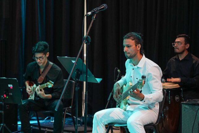 “Creación de 3 obras para bajo eléctrico y ensamble” de Alexander Gabriel Sandoval Aguilar; se basó en el sistema rítmico de la música carnática y contó con la tutoría de Rafael Guzmán. Desarrollado en el salón de Usos Múltiples del Pabellón Araceli Gilbert, en este concierto participaron con el proponente Michael Bowen, guitarra eléctrica; Daniel Sandoval, piano y sintetizador; Yiyer Astudillo, percusión menor; Kelvin Reyes, percusión; y, Benyi Romero, congas y tumbas. El proponente interpretó el bajo eléctrico.