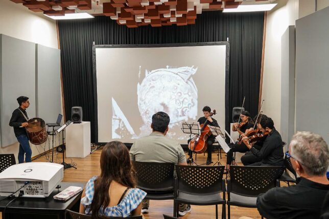 “Romance Nativo para Cuerdas”del tesista José Ricardo Murillo Sánchez, con la tutoría de Roberto Moscoso. Se realizó también este viernes 25, en Salón de Usos Múltiples del Pabellón Araceli Gilbert. Para este proyecto se tomó como referencia la obra del compositor ecuatoriano Luis Humberto Salgado para, a través del análisis, generar una propuesta que dialogara con las técnicas del reconocido creador y la experiencia personal del autor de la nueva obra.