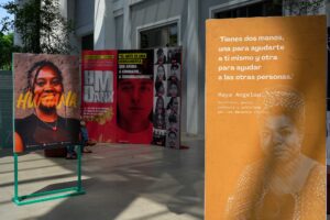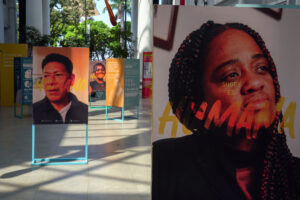 En otro apartado de la muestra está una sesión donde, en grandes letras, se lee: “El arte es una herramienta que ayuda a combatir… a sensibilizarnos”. Allí constan imágenes de artistas que participaron en la composición y producción de la canción “Humanx”. Son doce raperos y raperas de Colombia, Venezuela y de distintas regiones y nacionalidades del Ecuador, quienes a través del hip hop comparten sus vivencias y reflexiones con relación a la desigualdad, la discriminación y la movilidad humana.