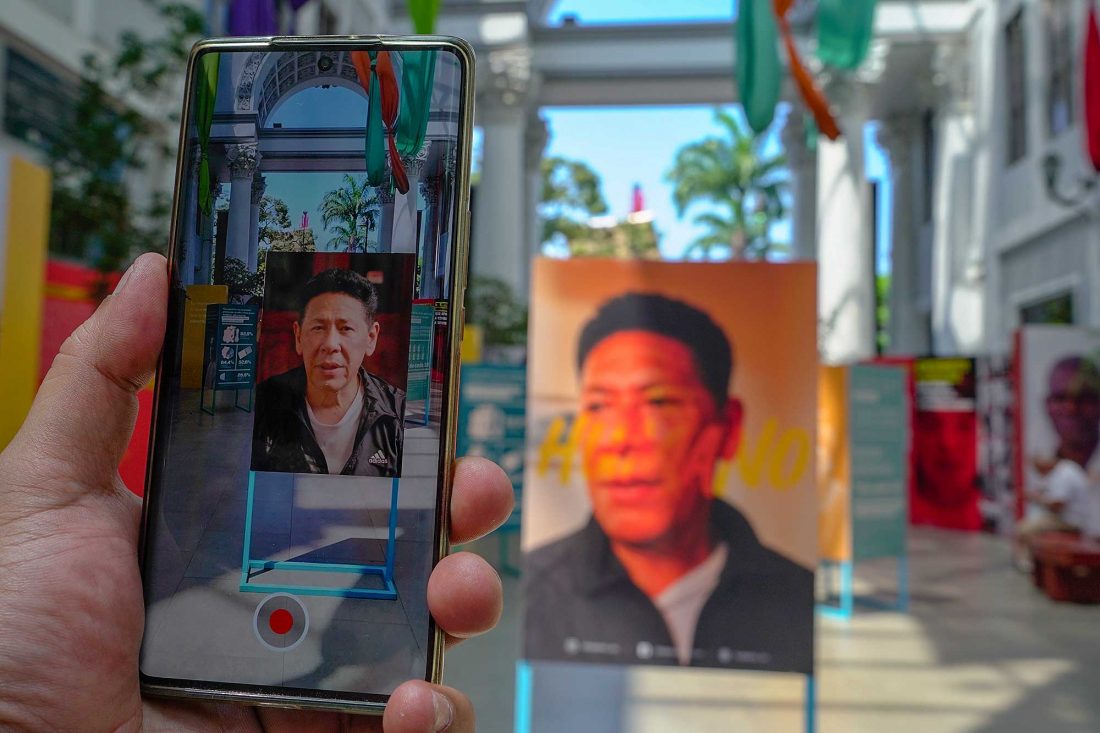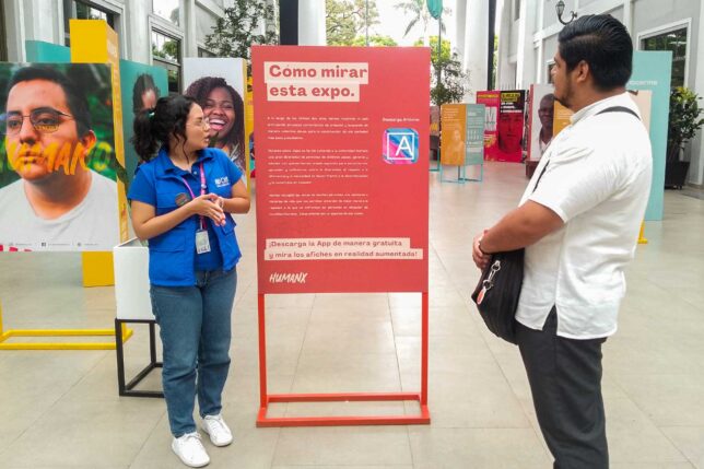 Tras el taller, Arianne García, de la OIM, tomó la posta con una visita guiada por “HUMANX”. Indicó que la productora de la exposición es Antonella Frisone y mostró ocho de los varios tótems instalados, cuyas imágenes (en grandes formatos) de migrantes llevan a audiovisuales en los que ellos cuentan sus historias. Fueron trabajadas con realidad aumentada, tecnología que permite superponer elementos virtuales sobre la visión que se tiene de la realidad, y se puede acceder descargando la aplicación Artivive.