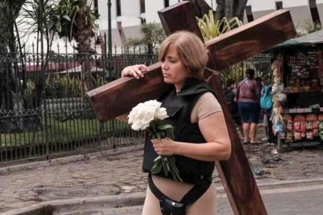 En el caso de la acción 6 de la pieza antes mencionada, se realizó en la Plaza de la Administración, Guayaquil. “Me coloco en los zapatos de los niños, jóvenes y adultos que delinquen porque no han tenido otra opción de vida dentro de un contexto marcado por las drogas y la violencia. Beso los veintiún pares de zapatos que representan a las pandillas que fueron acusadas de los episodios ocurridos el 9 de enero de 2024”, precisa.