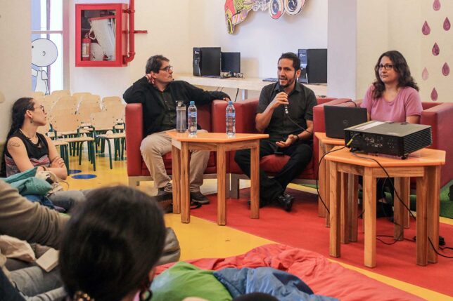 Luis Páez, quien estuvo en la dirección del proyecto de vinculación con la sociedad “Pacha”, que surgió y se ejecutó desde la asignatura de Laboratorio en Comunidad, del Departamento Transversal UArtes, compartió con el panel una nueva propuesta “La Esnaqui”, concebida como espacios culturales de paz y convivencia.