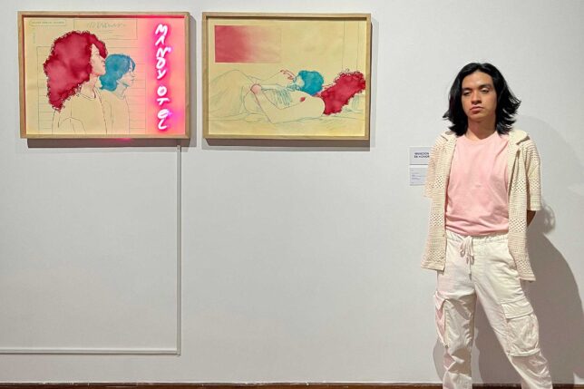 Daniel Morales cursa el séptimo semestre de la carrera de Artes Visuales, en el itinerario Prácticas Bidimensionales, y se dedica, además, a la música y artes escénicas. La mención de honor que obtuvo en el Salón de Julio 2024 fue por la obra “S/L (Sin lugar)”, la cual, comenta a InfoUArtes, surgió durante uno de los frecuentes recorridos que realiza con su pareja para hospedarse momentáneamente en uno de los hoteles de la calle Víctor Manuel Rendón, en Guayaquil. “Vivimos lejos de aquel sector y el trayecto hasta llegar a nuestro destino resulta atemorizante”, expresa, revelando también que fue la observación que hizo de la vida nocturna de la zona, que reúne a personas de largas noches, convirtiendo al sector en una suerte de periferia en medio del centro de la ciudad.