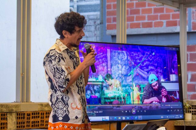 En la mMAT están también presentes invitados de Colombia, como el grupo de investigación de músicas del Pacífico Sur del Instituto Departamental de Bellas Artes de Cali, quienes brindaron esta tarde la ponencia-concierto “Patrimonio natural, composición musical, visuales y nuevas tecnologías”. “Su trabajo es igualmente interdisciplinar. Allá tienen el conservatorio y facultades de visuales, diseño y teatro y la maestría en Artes Vivas, entonces, es un proyecto interdisciplinar donde si bien la música es el centro tiene mucho de visuales y un poco literatura.