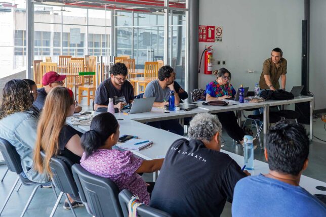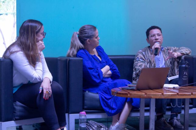 En el segundo día del encuentro, en la Plaza Pública del MZ14 se desarrolló la primera de tres mesas de diálogo. El tema abordado fue “Extractivismos, arte y resistencia comunitaria” y participaron: Natalia Roca, del Colectivo Entretejidas; Jonathan Borbor, del Comité Forestal Comuna Olón; Alma Alvarado, coordinadora de la Juventud Huancavilca de la comuna ancestral Engabao y Abel Cabrera, de 20 años, uno de sus integrantes, quien destacó la participación que tienen en la promoción de la identidad y cultura, así como la formación y el fomento a iniciativas colectivas y actividades culturales que fortalezcan los lazos con sus raíces e incentiven la preservación y toma de conciencia de sus historias. Moderó el diálogo Ana Carrillo, docente y directora del Departamento Transversal.