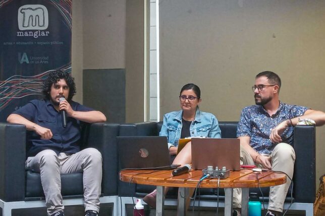 Con la mesa de diálogo “Fortalecimiento de actores en territorio desde la cultura, el arte y el patrimonio inmaterial” arrancó el tercer día de Manglar 2024 en la Plaza Pública del MZ14. Participaron Samuel Tituaña Lema, director de la Bienal Al Zur-Ich, en modalidad virtual; el alumnus Carlos Vizcaíno; y el docente Nicolás Schvarzverg. Intervino como moderadora María José Icaza, directora de Vinculación con la Sociedad UArtes.